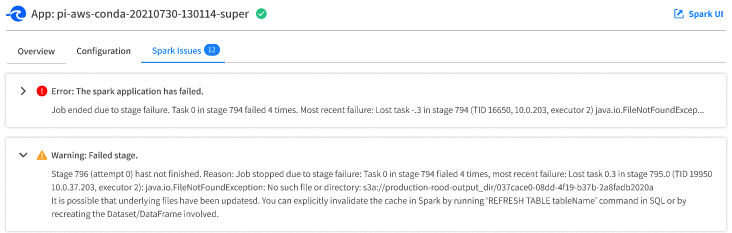 Click the Spark Issues tab to see a list of all the issues with error messages. Click on an issue to expand the card and view more detailed information about the error or warning.