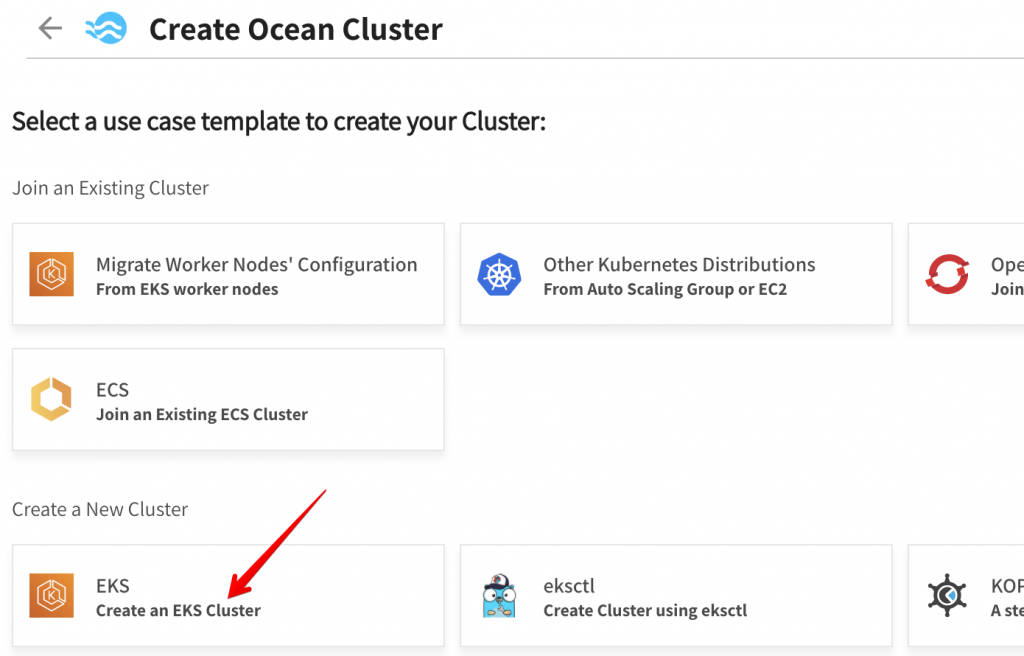 When the Create Ocean Cluster page appears, you must choose a use case template. Under Create a New Cluster, click Create an EKS Cluster.