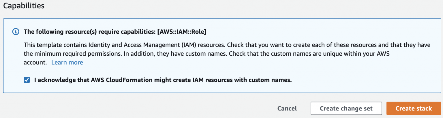 To launch the stack mark the checkbox at the bottom confirming CloudFormation will create IAM resources, and click Create stack.