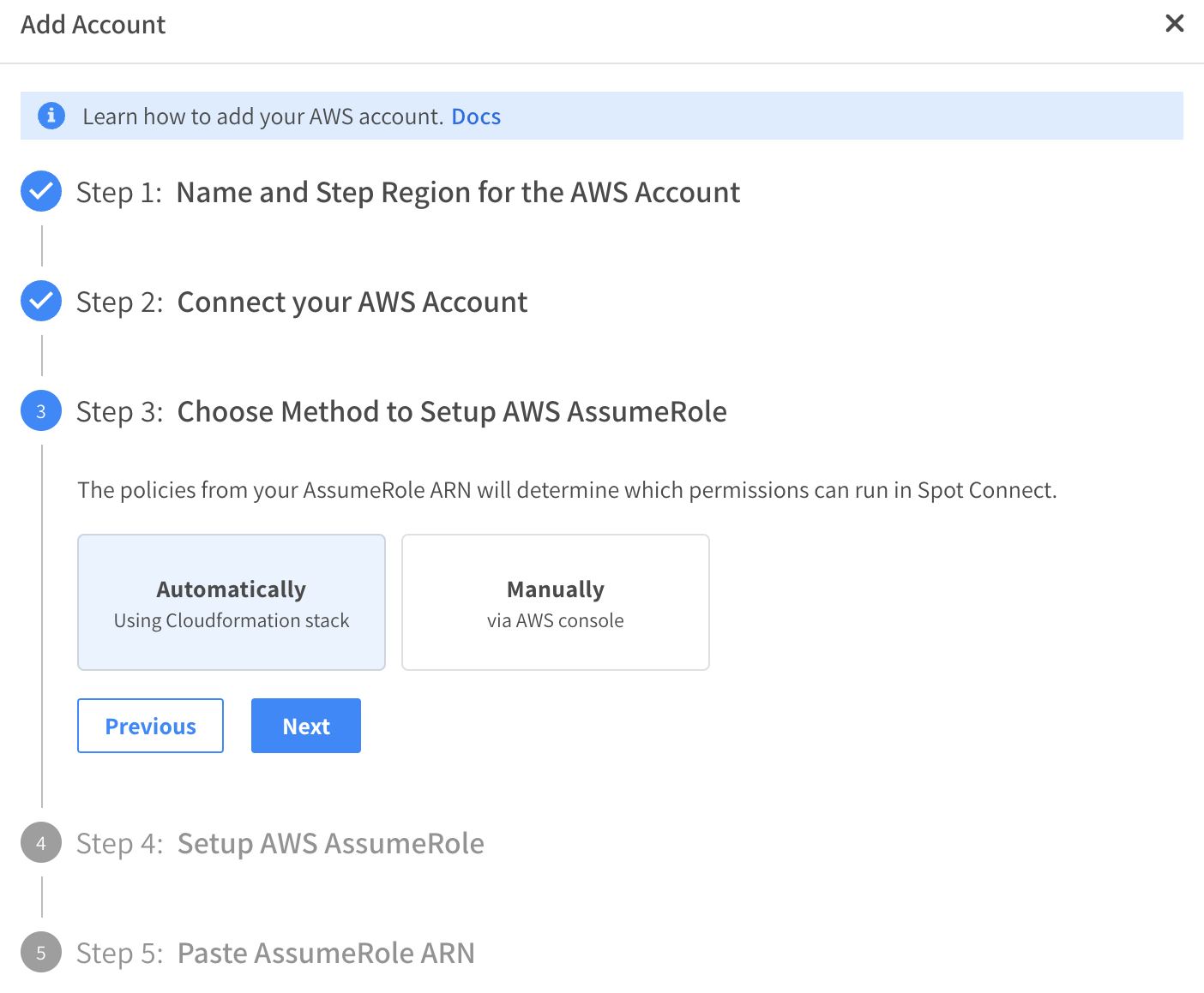 There are two ways to create an IAM role in your AWS account that enable Spot Connect to integrate with your AWS resources: