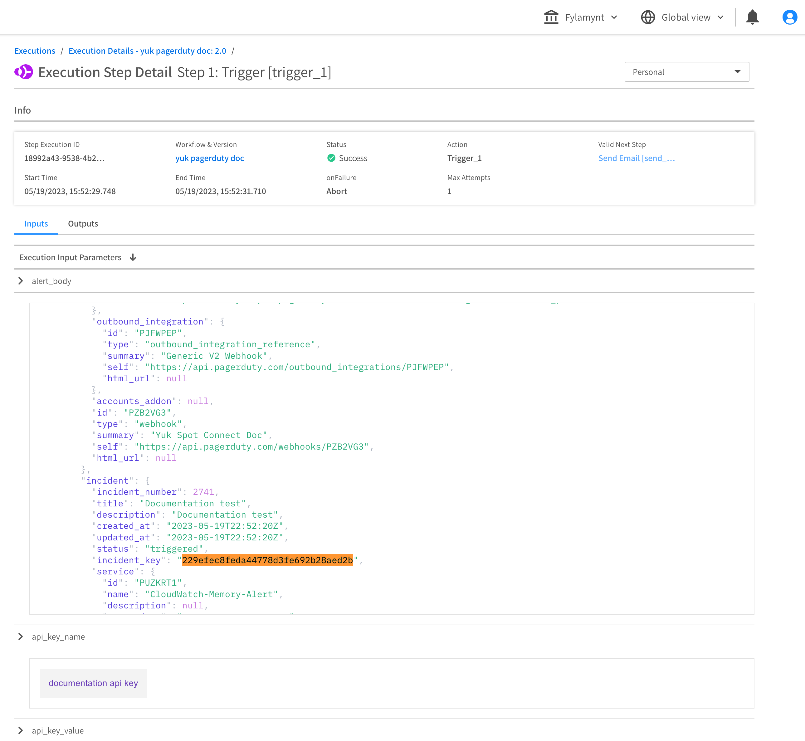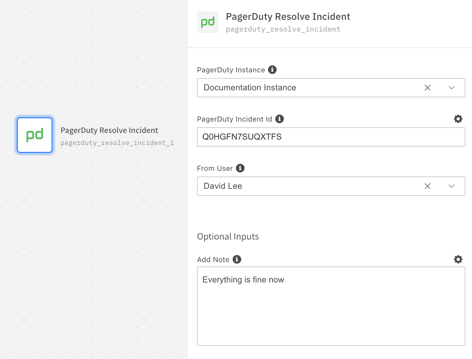 | Incident Title | Title for PagerDuty Incident to be created by this workflow execution. | True |