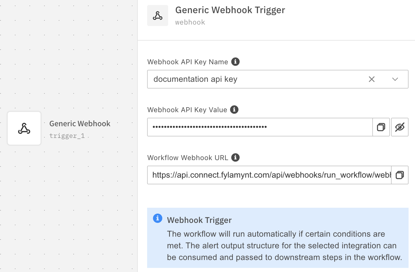 5. In the center panel of the workflow builder, click the Generic Webhook trigger node to open the right panel. Under Webhook API Key Name, select the API Key you created earlier.