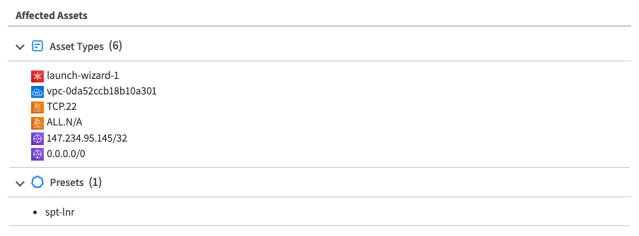 The Affected Resources list can be found under the Impact Map. The list of affected resources provides information of services and presets that are impacted by a risk. For each type, you can click the arrow to see the full list of resources of that type.