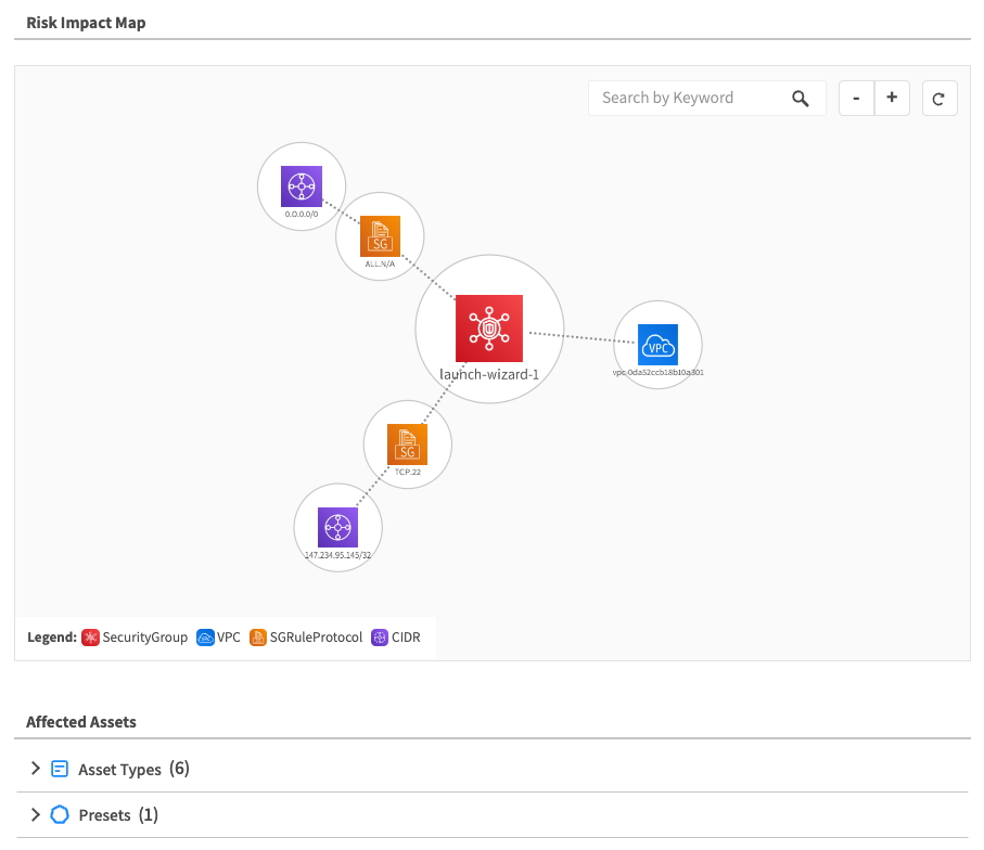 The risk impact map illustrates the relations of the various services, policies, instances, and other entities that are impacted by the risk. You can further see how the asset can be reached via public access by seeing which of its connected assets or protocols are internet facing. You can also use the search tool at the top of the map to search any asset by node name, connection, hostname, database, type, port, or username.